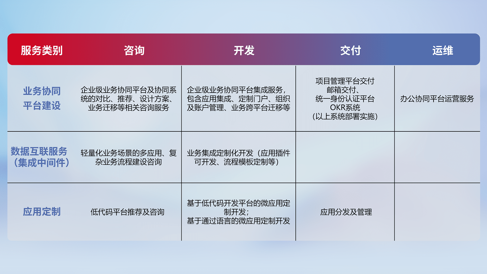 针对钉钉、、、、企微、、、、IDaas等平台级产品提供产品的规划、、方案、、交付、、、、定制化开发等服务,,,实现如统一协同办公、、、智能客户服务、、混合会议管理、、智能数据查询、、等业务场景,,实现数字化转型。。。。