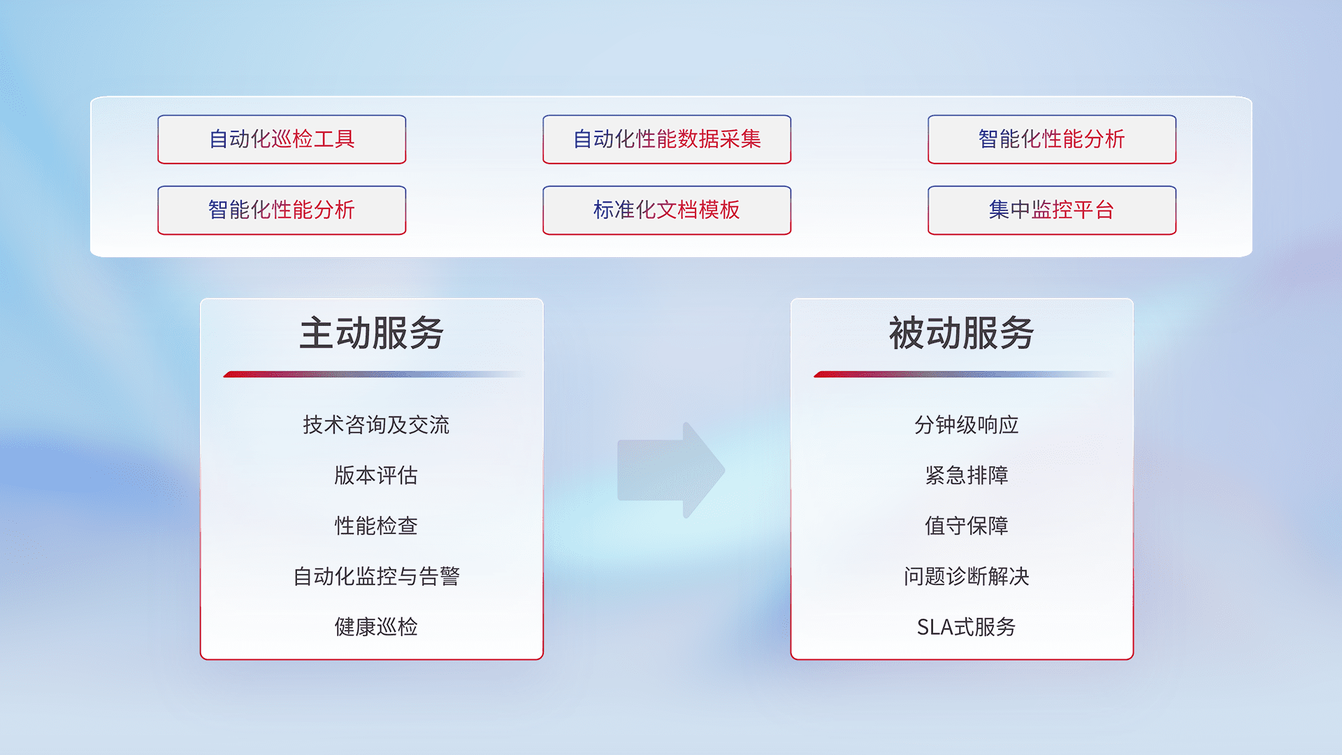 智能化工具和标准化文档,,,,保障服务质量,,,,提供主动服务(包含技术咨询、、、、版本评估、、、、性能检查、、、自动化监控与告警、、健康巡检)和被动服务包含(分钟级响应、、紧急排障、、值守保障、、、问题诊断解决、、、SLA服务)。。。